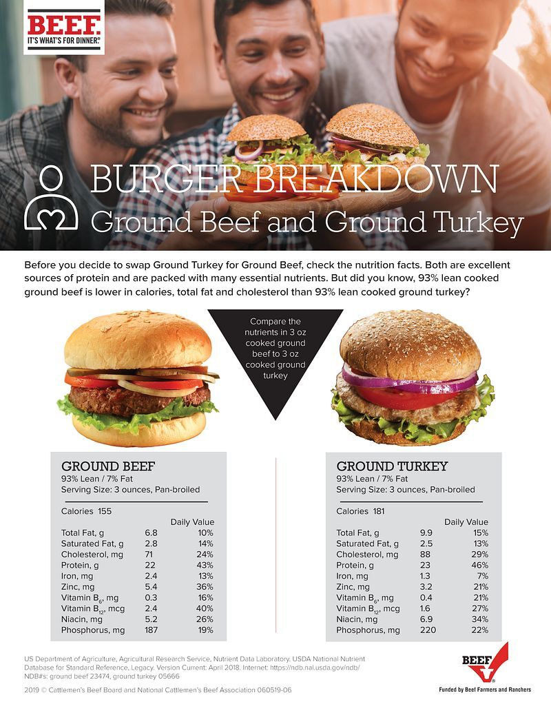 While we’re on the subject of other protein options, let’s also take a look at a comparison of Ground Beef and Ground Turkey – you just might be surprised by the results! Before you decide to swap Ground Turkey for Ground Beef, check the Nutrition Facts Label to make sure you’re making the best substitution for your health. Ground Beef has more of many essential micronutrients and lean ground beef can be lower in calories, fat and cholesterol than Ground Turkey. Here are the facts when comparing USDA’s data on 93% lean/7% fat cooked patties.