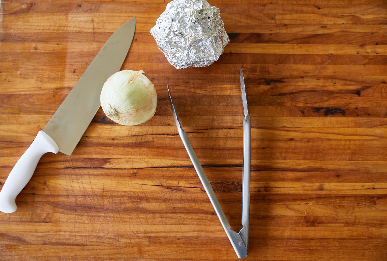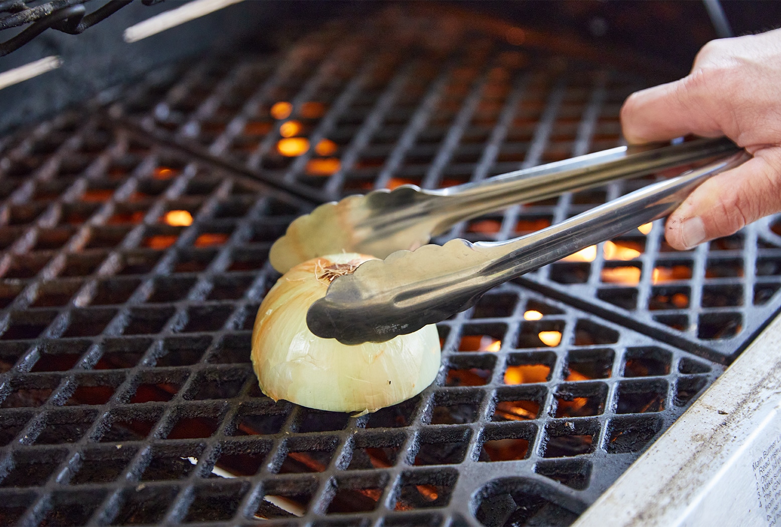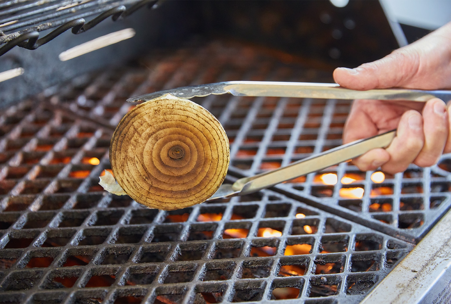 Step 3: Next, take an onion half and scrape the grill grates to remove any small debris that the foil ball didn’t pick up.