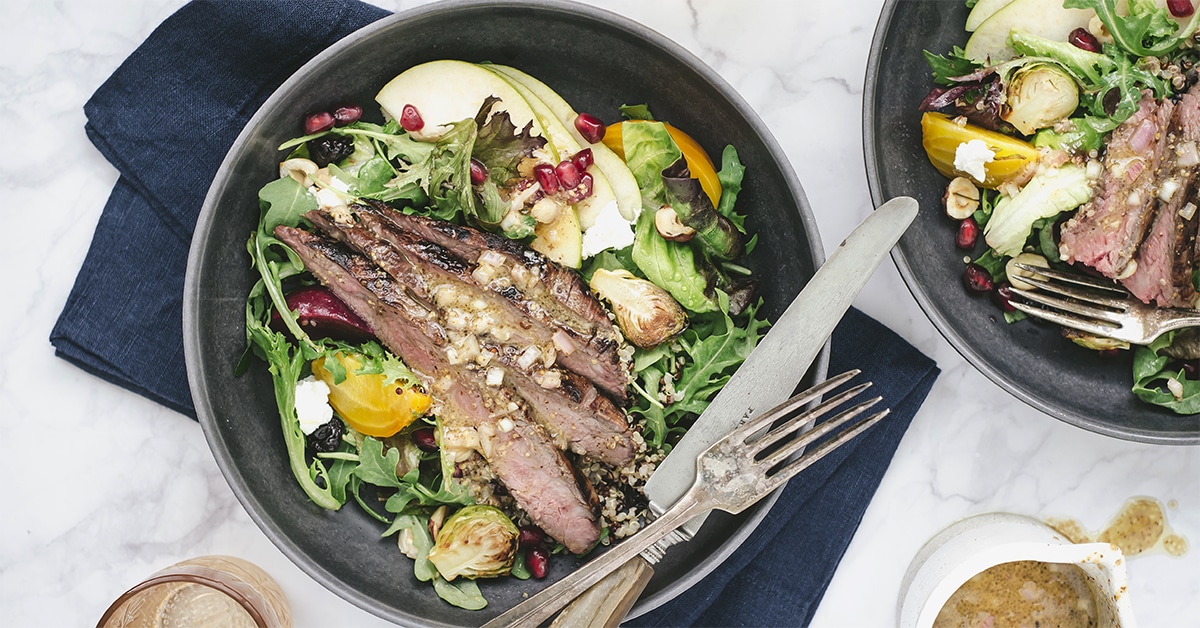 Enjoy the flavors of fall with this savory steak salad. Mouthwatering Flank Steak is served with roasted beets, Brussels sprouts, and quinoa with a flavor-packed dressing in this recipe from Gretchen Brown, RD.