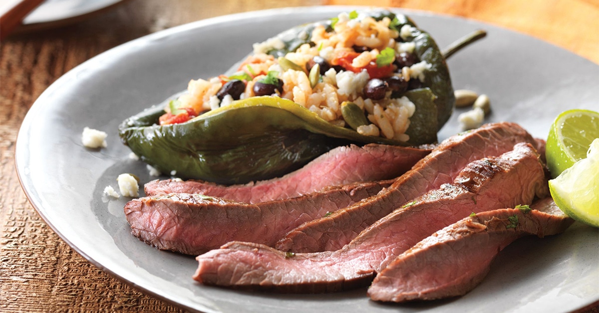 10. Lime-Marinated Flank Steak with Stuffed Poblano Peppers