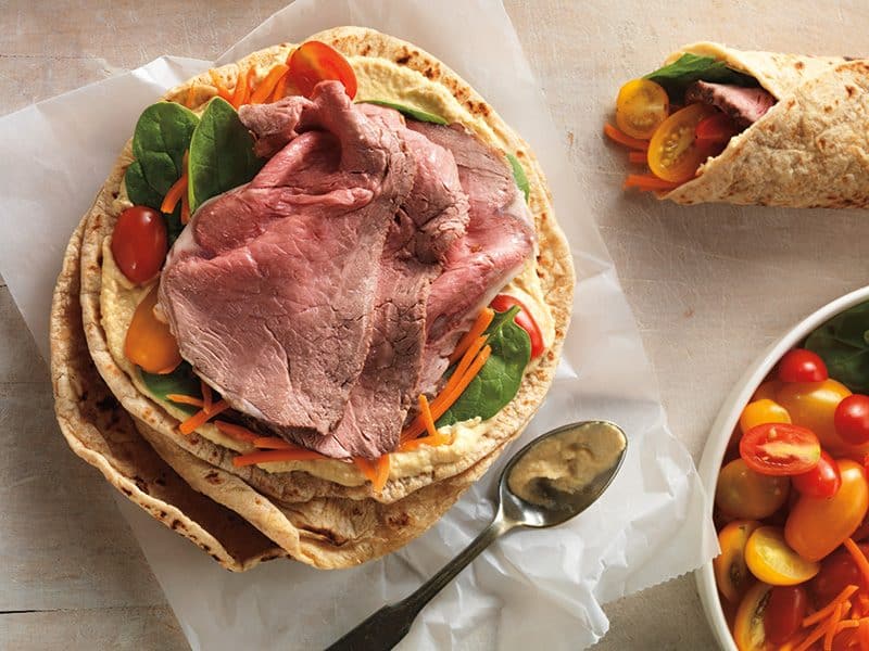 Deli roast beef, hummus and a variety of colorful vegetables make an easy-to-pack lunch that tastes great and keep energy rolling along all afternoon.
