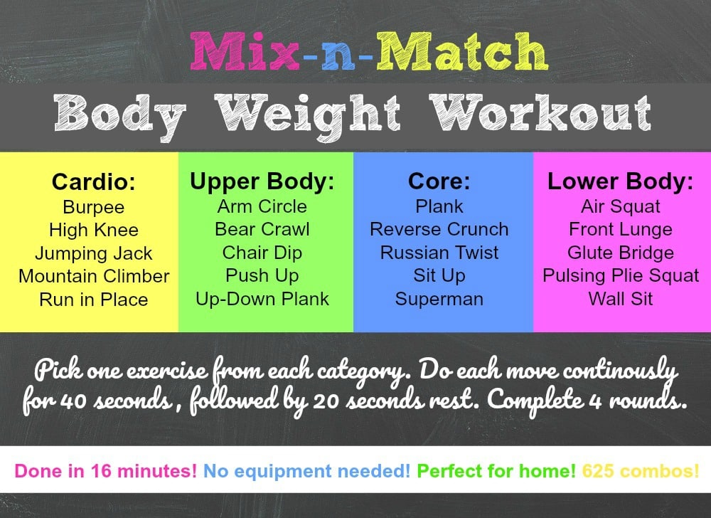 The next time you do the Mix-n-Match Workout, choose a different line up of exercises from the list. Our bodies are designed to get stronger and fitter with constantly varied movements over time. You’ll never get bored with the Mix-n-Match workout, I pulled out my calculator and discovered there are 625 various combinations!