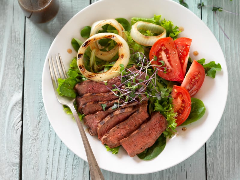 Steak and tomatoes couldn’t be prettier and perfectly portioned for a light but satisfying mid-day meal.
