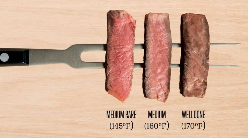 While we recognize that everyone’s tastes and doneness preferences are different, we prefer our steaks and roasts to be cooked to a final internal temperature of 145°F (medium rare) and our burgers cooked to a final internal temperature of 160°F (medium).