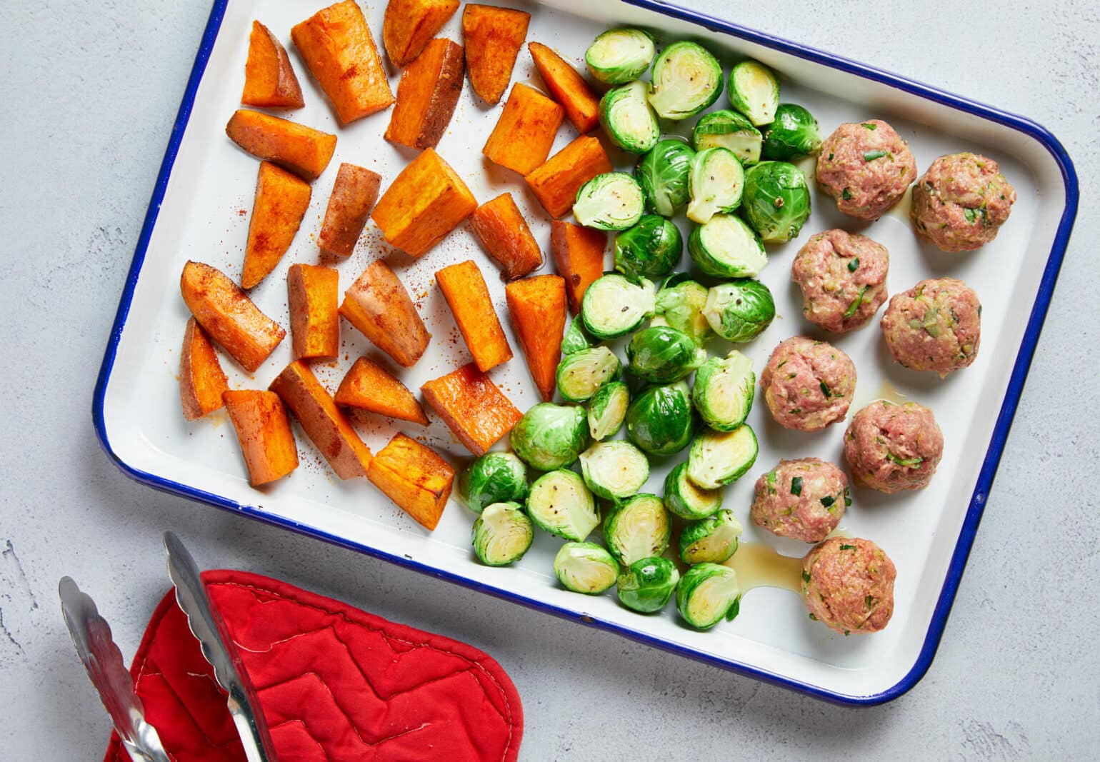 Roast in the bottom third of the oven for 10 minutes, then move sheet pan to the top third of the oven and cook until sweet potatoes and Brussels sprouts are tender and golden brown, and meatballs are cooked through, about 10 minutes more.