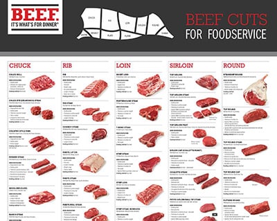 Beef cut posters are the most effective tools to learning more about the various cuts of beef where they come from on the carcass and the recommended cooking method for each cut. This beef cuts chart for foodservice contains the IMPS/NAMP number for each cut as well as order specifications and the cut tree.